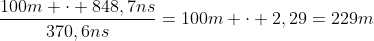 der Zug passiert die zweite Lichtschranke 370,6ns nach der Ersten und er braucht 848,7ns um an eine der beiden Lichtschranken vorbeizufahren. Setzt man die beiden Zeiten ins passende Verhältnis, bekommt man 2,29, was auch etwa dem Lorentz-Faktor für 0,9c entspricht. Die Reallänge des Zuges ist nun
