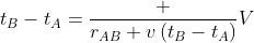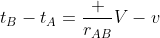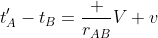 wobei rAB die Länge des bewegten Stabes — im ruhenden System gemessen — bedeutet. Mit dem bewegten Stabe bewegte Beobachter würden also die beiden Uhren nicht synchron gehend finden, während im ruhenden System befindliche Beobachter die Uhren als synchron laufend erklären würden.