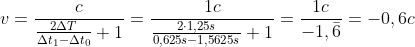wobei das Vorzeichen anzeigt, ob sich die Uhren voneinander entfernen (positiv) oder einander nähern (negativ). Man erkennt auf Anhieb, dass das Ganze auch mit dilatierten Zeiten (Dauern; ΔT=1,25s, Δt0=1,5625sΔ, Δt1=0,625s) funktioniert