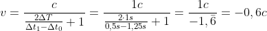 1. Zwei Uhren A und B sind zueinander bewegt und sie ermitteln ihre Relativgeschwindigkeit über Lichtimpulse, die im Abstand von ΔT=1s Eigenzeit erfolgen. Der erste Lichtimpuls kommt nach Δt0=1,25s zurück und der zweite nach Δt1=0,5s. Die Geschwindigkeit ist damit