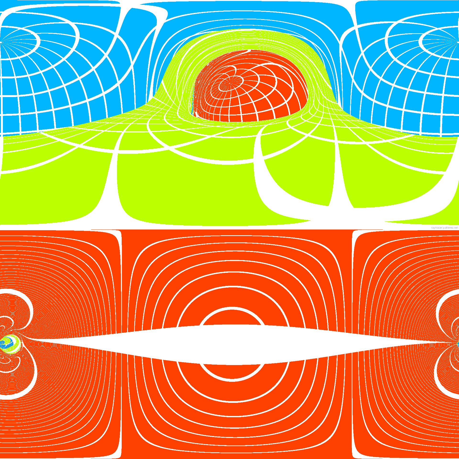 Bei Madore wird nicht zwischen den Wellenlängen unterschieden, der vernachlässigt die Frequenzen und deren Verschiebung. Der hat dort wo ich den Sternenhintergrund habe ein blaues Grid, knapp über dem Horizont ein rotes (also dort wo ich die halbdurchsichtige Erdschale aufspanne), und das grüne ist wahrscheinlich der Cauchy Horizont, obwohl man den von außen eigentlich nicht sehen sollte. Die Grids in den anderen Farben so wie braun und türkis etc. stehen wohl für den Sternenhintergrund im negativen Raum und außerhalb des weißen Lochs, wobei man das Exterior des weißen Lochs innerhalb des schwarzen Lochs eigentlich auch nicht sehen sollte (man könnte aber darstellen wo ein Grid das vom Beobachter aus projiziert wird den inneren Horizont trifft, nur den Beobachter sollte so lange dieser außerhalb des inneren Horizonts ist kein Licht von diesem erreichen). Aus dem negativen Raum hinter der Ringsingularität könnte man aber Licht empfangen, vorausgesetzt dass derselbe nicht leer ist (in meinen Bildern ist er leer, also schwarz).