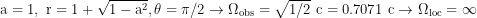 Bild Yukterez, klipp und klar, hat geschrieben:ω=dФ/dt=2a/(r³+a²r+2a²) - Dann sieht man dass am Ereignishorizont für dФ/dt=1/2 herauskommt - allerdings nicht ½ c, sondern ½ c³/G/M. Die Winkelgeschwindigkeit muss dann natürlich noch mit einem Radius multipliziert werden, nur eben nicht mit r sondern (am Äquator) mit √(x²+y²)=√(r²+a²)=√2. Im System eines ausreichend weit entfernten Koordinatenbeobachters rotiert der Ereignishorizont daher mit c/√2