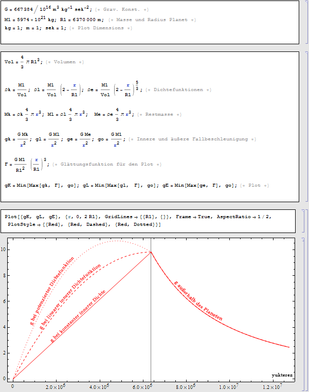 Die Schwerkraft sinkt nach innen hin zwar ziemlich linear zum Radius, aber die Fläche auf die dieselbe drückt wird quadratisch verringert. Die sinkende Schwerkraft wird also mehr als überkompensiert. Bei einer in grober Näherung angepassten Dichtefunktion sieht der Druck im Inneren der Erde cirka so aus:
