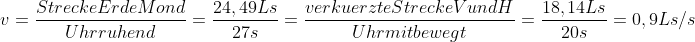 An dem ist aber nicht, bleiben wir mal bei Fall A, die Ruhelänge Erde/Mond ist 18,14 Ls und die von H/V 24,49 Ls. Der Abstand Erde/Mond ist für die Rakete bewegt kontrahiert auf nur 13,44 Ls. Schau mal wie das mit der Geschwindigkeit über die Strecken ausschaut: