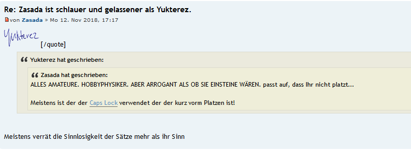 Zasada hat geschrieben:ALLES AMATEURE. HOBBYPHYSIKER. ABER ARROGANT ALS OB SIE EINSTEINE WÄREN. passt auf, dass Ihr nicht platzt...
