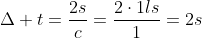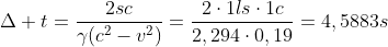 Und du gibst schon Falsches vor, Gamma ist ja nicht bekannt, auch v nicht, deine Geschwindigkeit gegenüber dem Raum. Bekannt ist ist die Strecke, der Zug hat eine Länge von 1 Ls und die muss zwei mal überwunden werden, die Geschwindigkeit mit der das Signal im Ruhesystem des Zuges sich bewegt ist v = c und damit braucht das Licht eben für jeden Weg genau 1 s und in Summe eben zwei Sekunden.
