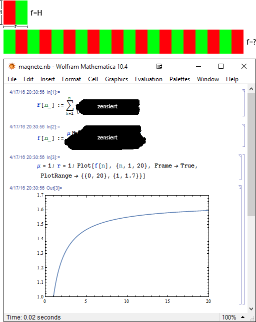 Wir haben ein Sortiment von Magneten der Stärke μ mit einer Seitenlänge von r. Wenn wir einen Magneten an den anderen reihen, in welchem Verhältnis nimmt die Stärke des Magnetfelds am Ende dieser Reihe relativ zur Anzahl der hinzugefügten Magnete zu?