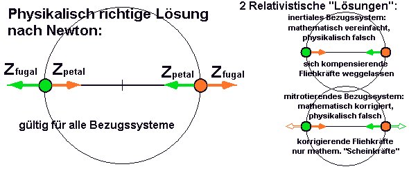 Es gibt nämlich keine Zentripetalkraft ohne ein Umlaufssystem, und es gibt kein Umlaufssystem ohne mindestens zwei Massen, die einander um den gemeinsamen Schwerpunkt umlaufen. Es ist der Hütchenspielertrick der Relativisten, nur von einem Körper auszugehen, und die Drehachse als fest verankert in einer großen Masse anzunehmen, und diese große Masse nicht zu beachten. In diesem Falle ist aber die große Masse der andere Umlaufkörper, und beide Massen laufen auch hier um ihren gemeinsamen Schwerpunkt.