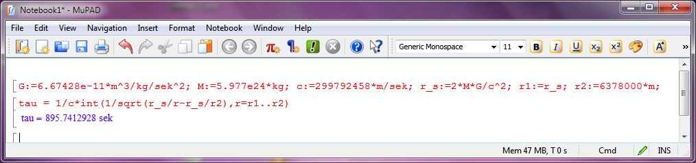G:=6.67428e-11*m^3/kg/sek^2; M:=5.977e24*kg; c:=299792458*m/sek; r_s:=2*M*G/c^2; r1:=r_s; r2:=6378000*m;