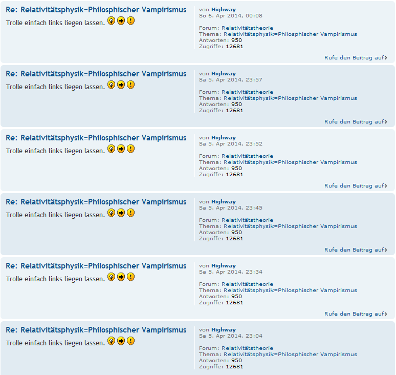 Yukterez hat geschrieben:Hannes macht sich gemeinsam mit All, Chief und McDaniels nur einen Spaß; alle vier wissen ja selber, dass jeder, der sich mit dem Thema schon einmal beschäftigt hat, ihren unsinnigen Schabernack sofort durchschauen muss. Sie richten sich an ein Zielpublikum, das von der Sache noch nie etwas gehört hat, und obendrein zu dumm oder faul zum selber googlen ist.