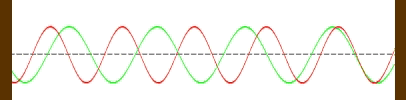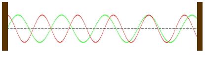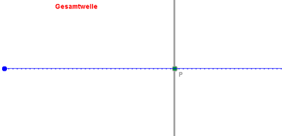 Die in der obigen Animation hinlaufenden und zurücklaufenden Wellen überlagern sich, und das Ergebnis ist eine neue Welle durch einfache Addition der Amplituden. Im links dargestellten Fall handelt es sich um eine stehende Welle, weil der Abstand zur Reflexionswand genau das Mehrfache einer halben Wellenlänge beträgt, und Geschwindigkeiten und Wellenlängen der beiden überlagerten Wellen gleich sind. Auch die resultierende Gesamtwelle kommt mit unveränderter Phasenlage zum Sender zurück! |
